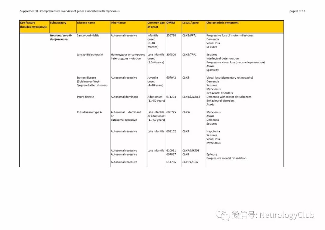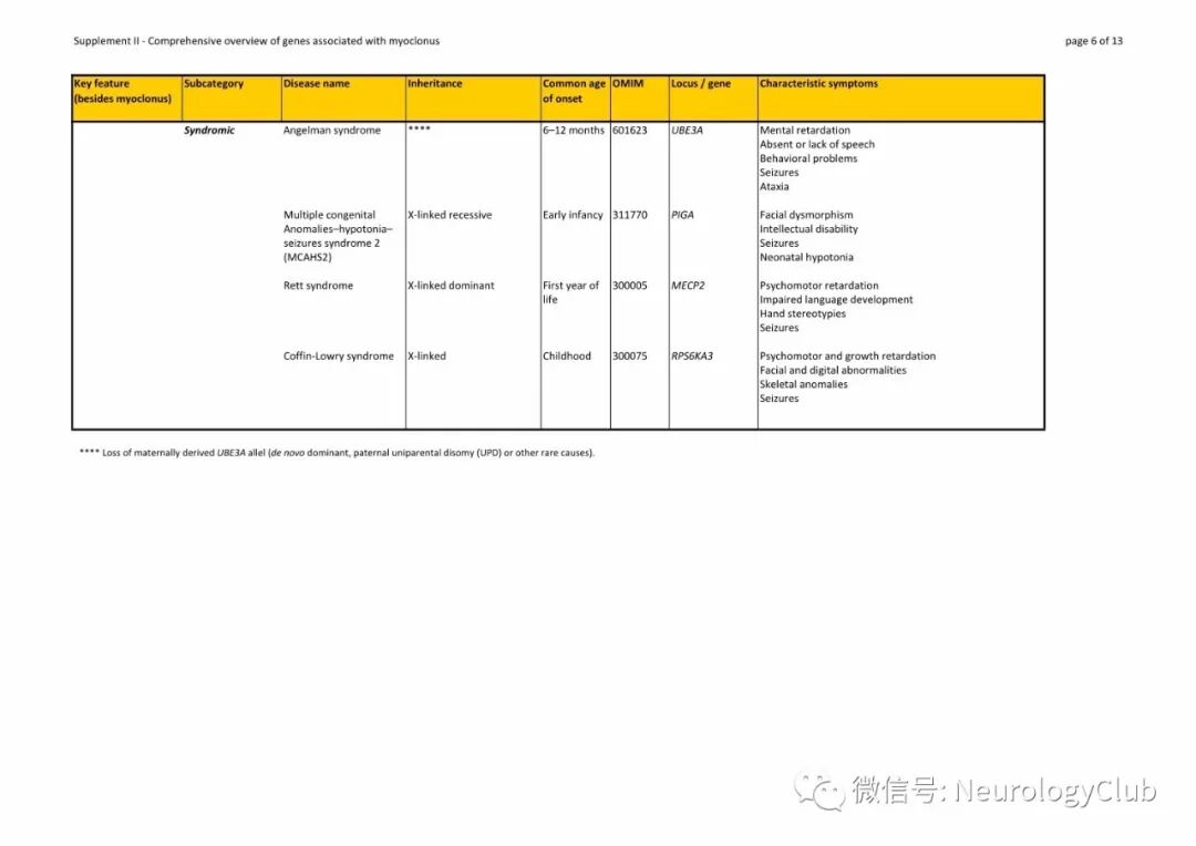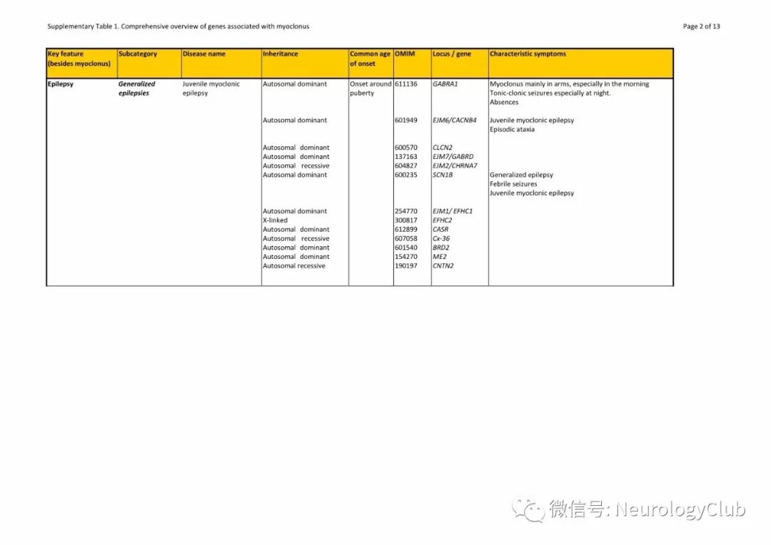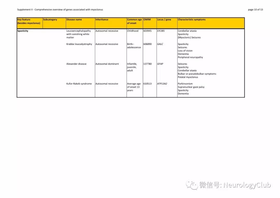 若之前的诊断步骤都无法明确肌阵挛的原因,那最后一步就是NGS,来排除神经遗传性疾病。附表全面提供了与肌阵挛相关的基因与疾病。在临床实践过程中,应根据除肌阵挛以外的主要临床特征(肌张力障碍、癫痫、痉挛状态、共济失调、痴呆、帕金森症状)对这些基因进行分类。