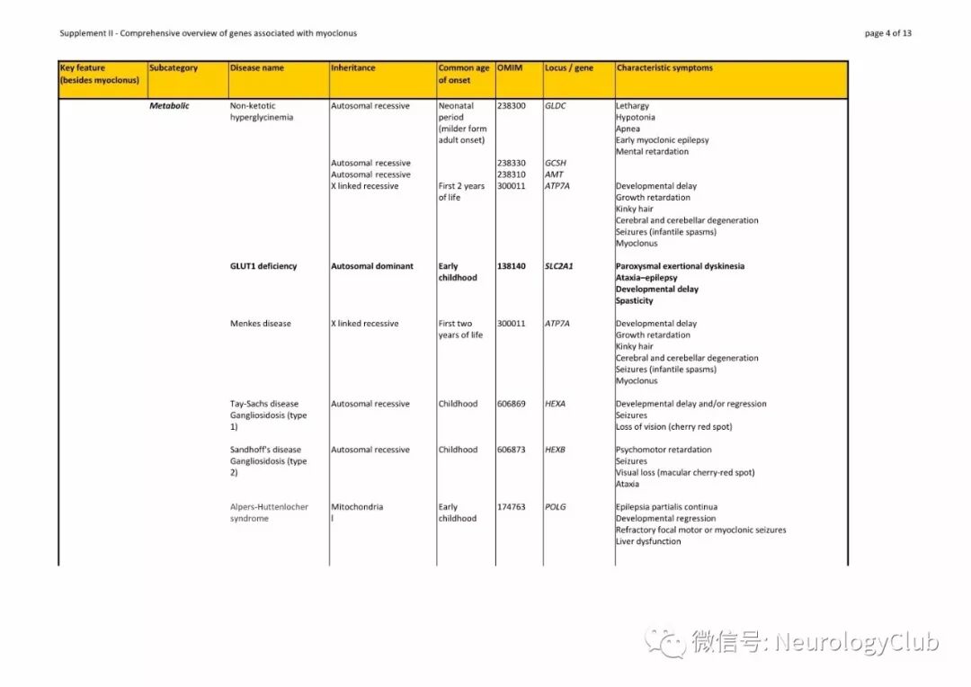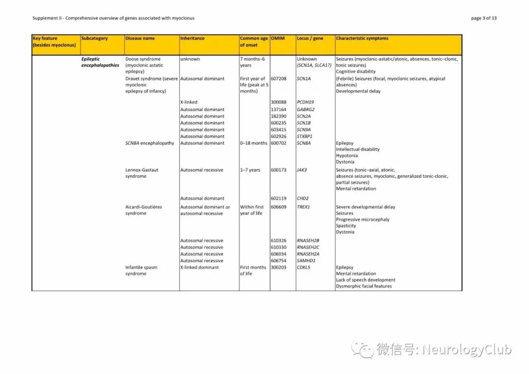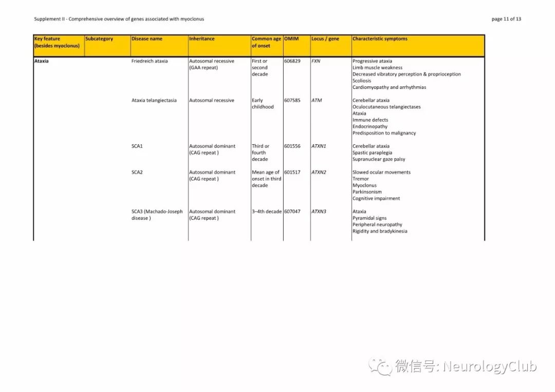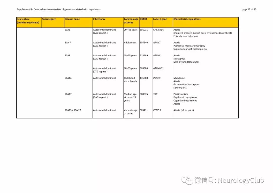 若之前的诊断步骤都无法明确肌阵挛的原因,那最后一步就是NGS,来排除神经遗传性疾病。附表全面提供了与肌阵挛相关的基因与疾病。在临床实践过程中,应根据除肌阵挛以外的主要临床特征(肌张力障碍、癫痫、痉挛状态、共济失调、痴呆、帕金森症状)对这些基因进行分类。