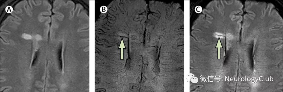 图6:A:T2-FLAIR上可见累及脑室周围白质的典型卵圆形脱髓鞘病变;B-C:磁敏度加权成像和T2-FLAIR及磁敏度加权成像融合(T2-FLAIR *)可见中央静脉征