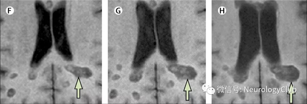 图9:56岁继发进展型多发性硬化女性患者,其基线(F),2年(G)和4年(H)时的3T磁共振;T1WI可见左侧脑室后角白质病灶缓慢扩大(体积增加,信号越低)
