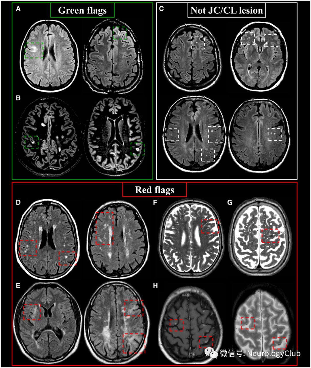 图2:MS患者皮质/近皮质典型和非典型病灶以及不应该计数在内的病灶;左上:绿旗征:提示MS的近皮质(A)和皮质(B)病变;右上:(C)白质病灶未接触皮质或位于皮质内(皮质下);底部:红旗征:(D)皮质下和深部白质多发病灶,提示小血管病;(E)进行性多灶性白质脑病累及不同脑叶灰质和白质,边界模糊不清;(F)扩大的血管周围间隙,为点状或条纹状边界清晰的脑脊液样信号;(G) T2WI低密度提示微出血导致的含铁血黄素沉积;(H)中枢神经系统血管炎可见T1WI多发软脑膜和皮质高信号伴梯度回波序列低信号;JC/CL=近皮质/皮质