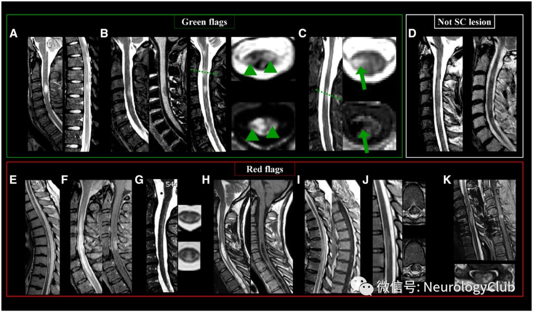 图4:MS患者脊髓典型和非典型病灶以及不应该计数在内的病灶;左上:绿旗征:(A)矢状位短时间反转恢复序列上颈、胸髓病灶;(B)3T-T1WI上可见颈髓低信号(绿箭头);(C)T2WI和相位敏感 反转恢复序列可见颈髓病灶累及侧柱和中央灰质(绿箭);右上:(D)弥漫性脊髓病变,边界不清,不符合脊髓病灶的定义;底部:红旗征:(E)见于NMOSD的纵向广泛性脊髓受累,病灶范围在3个节段以上;(F)见于神经结节病的纵向广泛性脊髓受累,病灶范围在3个节段以上,伴软脊膜和脊髓周围强化;(G)见于亚急性联合变性的广泛选择性侧柱和后柱受累;(H)脊髓空洞;(I)见于动静脉瘘的广泛性T2高信号病灶,从脊髓圆锥前部延伸,可见斑点状和扭曲强化;(J)见于亚急性缺血性脊髓病的胸髓前部高信号病灶,延伸累及两个以上椎体节段;(K)脊髓型颈椎病患者颈髓T2高信号病灶,可见“薄煎饼样”强化;SC=脊髓。