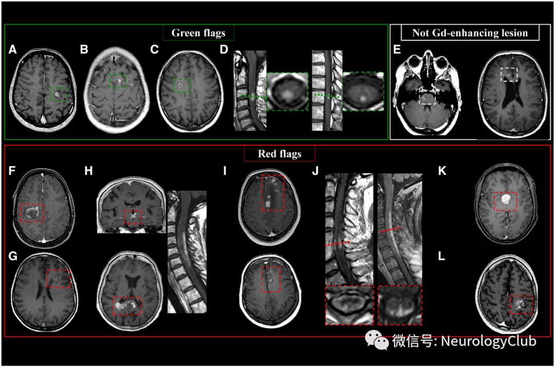 图5:MS患者典型和非典型强化病灶以及不应该计数在内的病灶;左上:绿旗征:MS强化病灶:(A)结节样;(B)开环征;(C)闭环征;(D)脊髓结节样强化;右上:(E)毛细血管扩张症(不纳入诊断标准);底部:红旗征:(F)提示非典型特发性炎性脱髓鞘病灶的不均匀强化瘤样大病灶(>2cm);(G)Balo病带状强化;(H)NMOSD患者间脑、胼胝体云雾状强化和纵向广泛脊髓受累;(I)中枢神经系统血管炎软脑膜、皮质和皮质下不规则强化;(J)神经结节病软脊膜强化及轴位“三叉戟征”;(K)抗Ma2脑炎间脑均匀增强;(L)胶质母细胞瘤不规则不均匀强化