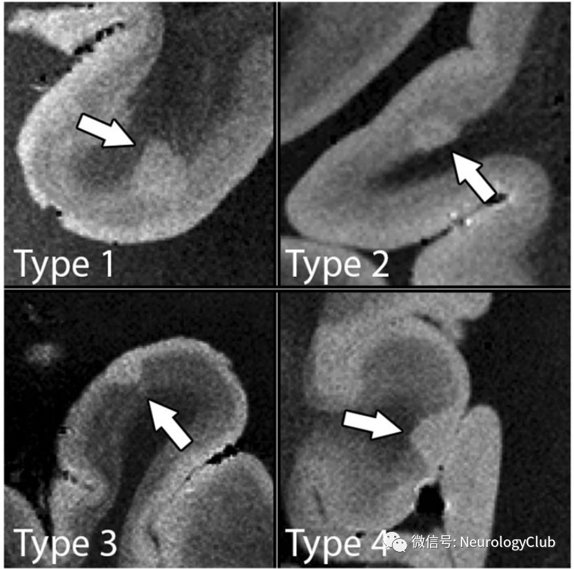皮质病灶分4型,I型(皮质-白质混合型),病灶累及皮质深层及其相邻白质 ;II型(皮质内型),以血管为中心的小的脱髓鞘病变,局限于皮质内 ;III型,病灶从软脑膜表面延伸入皮质;IV型,病灶累及全皮质层而未累及皮质下白质;III型和IV病变简称为软膜下型病变,可以是局限的,也可能累及多个相邻的脑回,甚至可以累及所有皮质区域,但未累及皮质下的白质,称为“广泛软脑膜下脱髓鞘”。