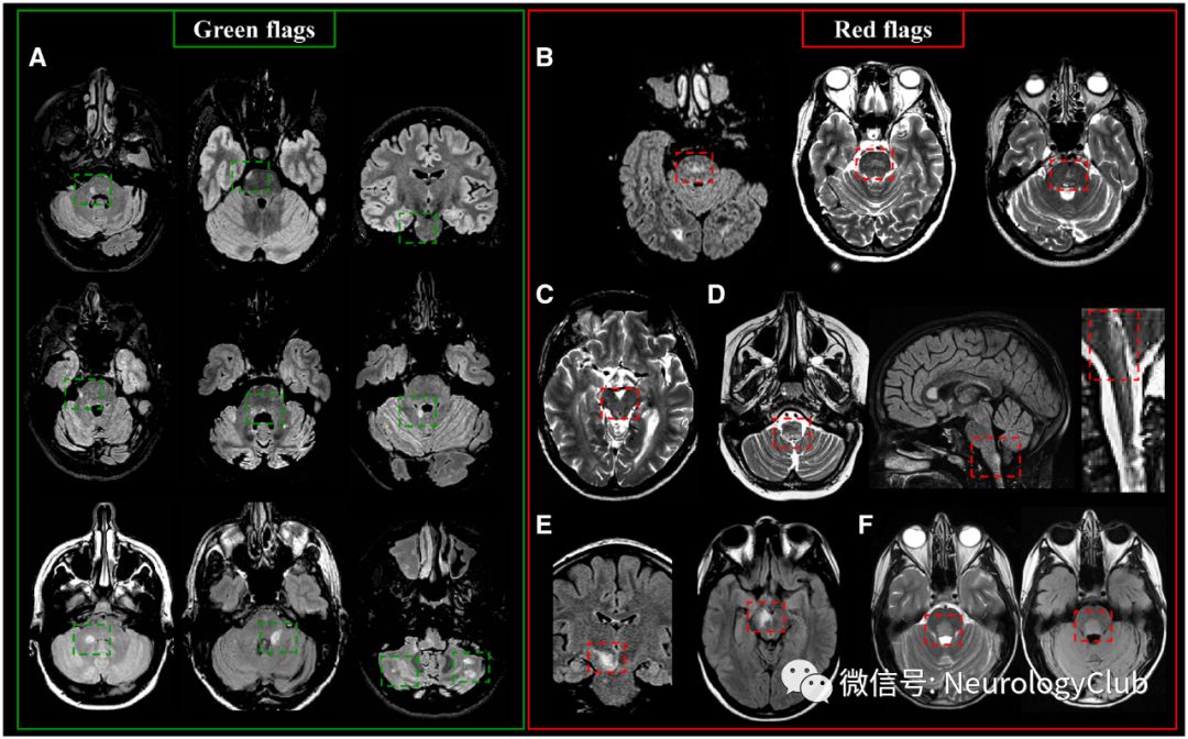图3:MS患者幕下典型和非典型病灶;左:绿旗征:(A)幕下病灶;右:红旗征:(B)见于小血管病的对称性脑桥中央病灶;(C)NMOSD导水管周围病灶;(D)NMOSD极后区病灶;(E)MOG抗体相关疾病中脑-间脑病灶;(F)神经白塞病邻近四脑室底的大的卵圆形病灶