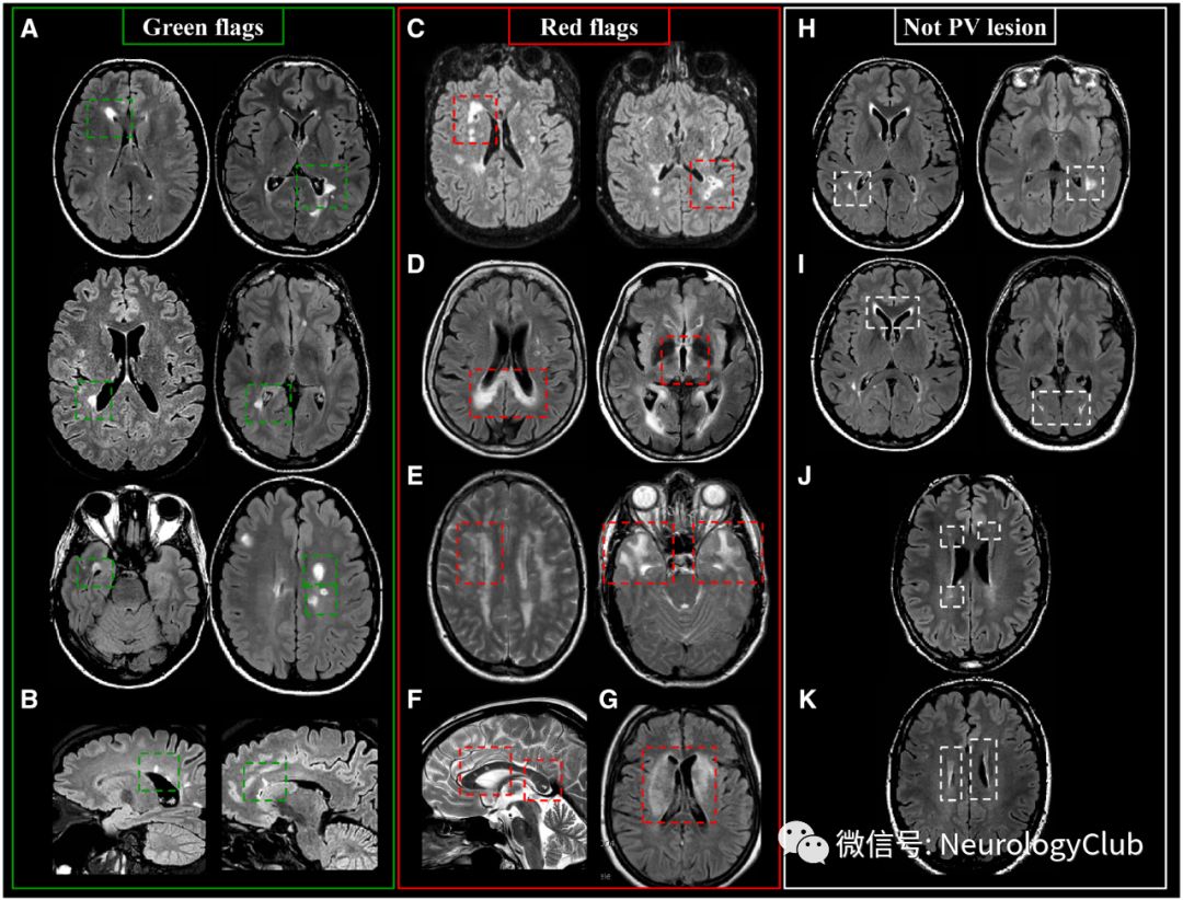 图1:MS患者脑室周围典型和非典型病灶以及不应该计数在内的病灶;左:绿旗征:(A)提示MS的脑室周围病灶;(B)垂直于胼胝体的脑室周围病灶(Dawson手指征);中间:红旗征:(C)累及脑室旁及深部灰质的多发白质病灶,提示缺血性小血管病灶;(D)NMOSD患者广泛的胼胝体压部受累和双侧间脑病灶;(E)常染色体显性遗传性脑动脉病伴皮质下梗死(CADASIL)累及深部白质、外囊和颞叶的多发病灶;(F)胼胝体内“雪球样”病灶(Susac综合征);(G)系统性红斑狼疮累及双侧白质和深部灰质的弥漫性和广泛性病灶;右:不应认为是脑室周围病灶:(H)不接触脑室的病灶:(I)脑室前后角对称病灶(侧脑室带帽征);(J)病灶长轴小于3mm;(K)邻近侧脑室的对称线性高信号;PV=脑室周围