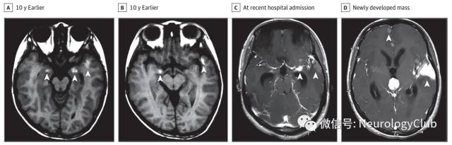 (图:A-B:10年前的T1WI可见脑桥、双侧杏仁核和左侧颞极多发脑实质病灶;C-D:增强T1可见左侧颞叶病灶明显进展,累及颞极和大脑侧裂旁区域,三脑室出现新发肿块伴梗阻性脑积水)