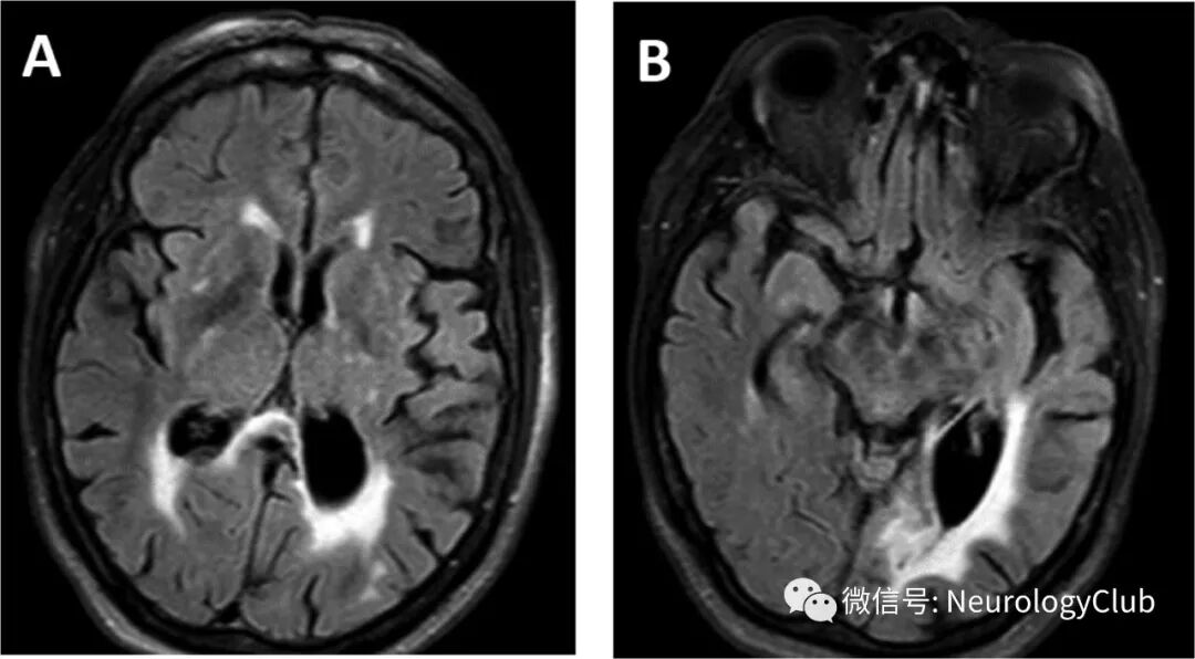 (图2:激素治疗数周后复查FLAIR证实水肿几乎完全好转,可见慢性脑室旁小血管病变所致白质高信号以及陈旧性左枕叶梗死)