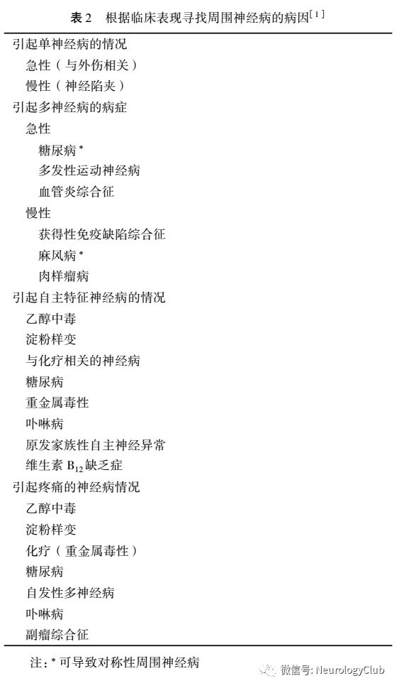 若出现神经病症状,踝反射和远端感觉降低,不考虑远端肌肉无力或萎缩,或许可做出周围神经病的诊断。神经病症状独立出现或踝反射降低很少有诊断价值。周围神经病有些原因所具有的特征:单神经病损、有些为多神经受累,而其他有自主功能不全或疼痛突出(见表2)。