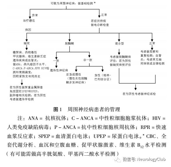 2.4 神经活检 若试验室检测和电诊断检查依然不能确诊,或启动攻击性治疗(如采用类固醇或化疗时可发生血管炎)前需确诊,应考虑做神经活检。腓肠和腓浅神经为活检首选。若所有检查都未能识别原因或电诊断检查提示轴突型对称性周围性神经病,特发性周围神经病为预诊断。