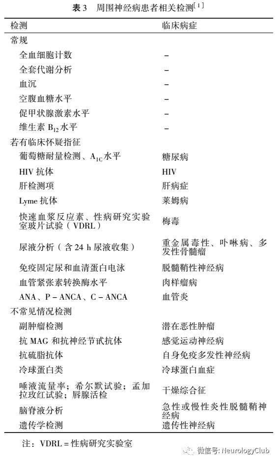2.2 诊断性检测 对周围神经病患者评估始于单纯血液检测,包括CBC、全套代谢分析(全套代谢分析有助于医生对患者营养和代谢健康情况进行评估,便于提供靶营养干预)、血沉和空腹血糖、维生素B12和促甲状腺激素水平检测(见图1)。若有临床指征可做附加检测,包括副肿瘤检测,以评估隐匿恶性肿瘤;抗髓鞘相关糖蛋白(抗MAG)抗体检测以评估感觉运动神经病;抗神经节苷脂抗体(抗GM1)检测、CSF分析以评估自动免疫多发神经病;若怀疑遗传性周围神经病做遗传学检测(见表3)。