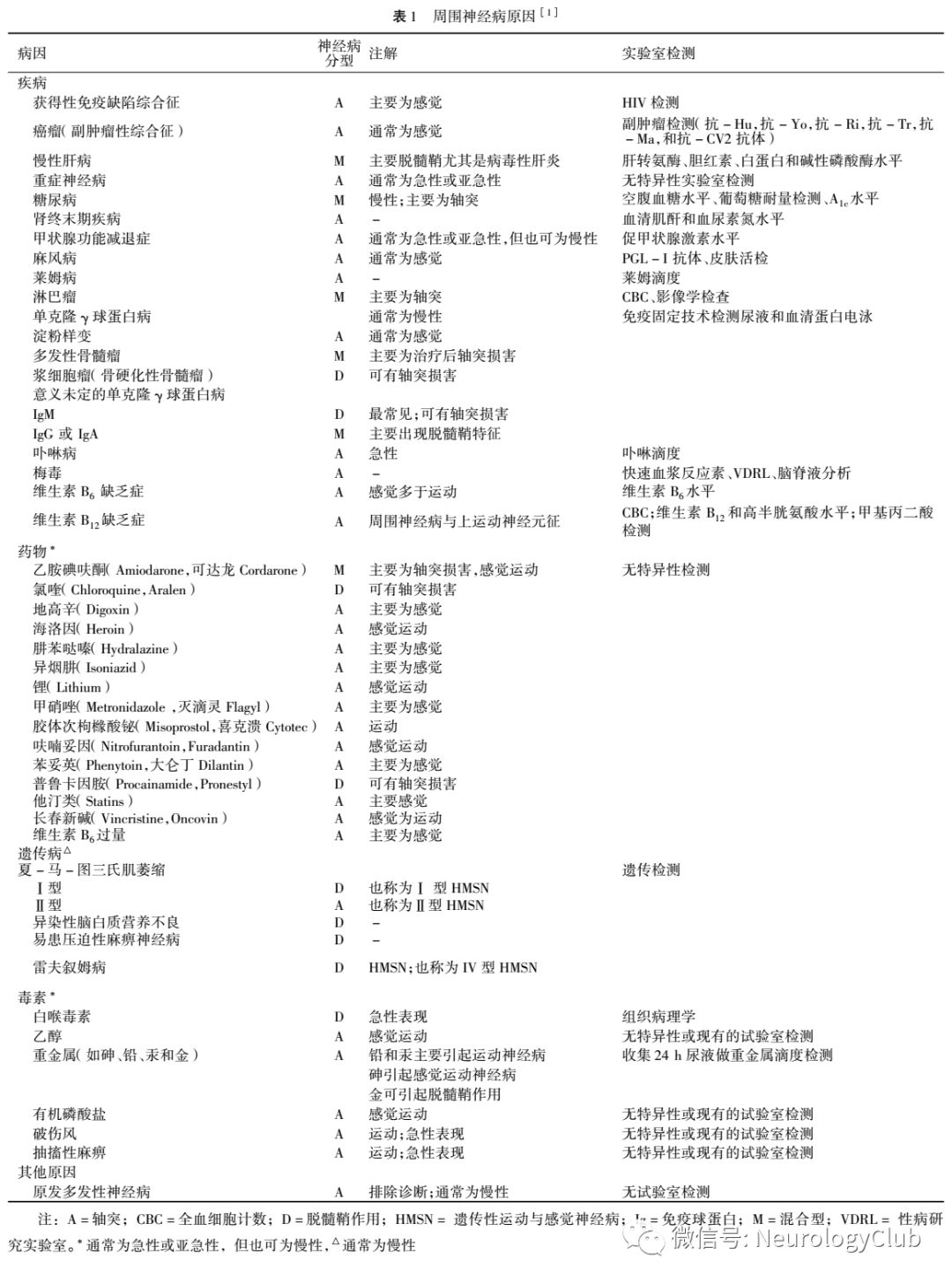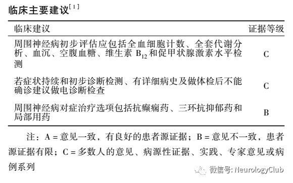 周围神经病可因系统性疾病、毒物暴露、药物治疗、感染和遗传性疾病多种原因引起(见表1)。最常见可治疗原因有糖尿病、甲状腺功能减退症和营养缺乏。