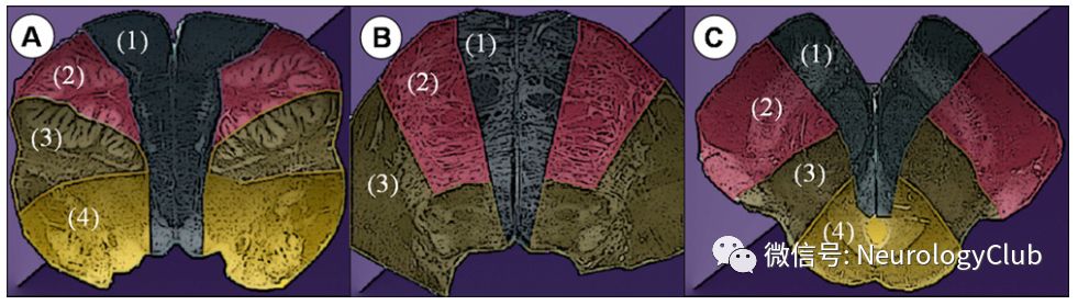 在延髓水平,根据不同的血管支配可划分为4个不同的区域(图1A)。前内侧组动脉源自脊髓前动脉末端和椎动脉颅内部分,前外侧组动脉也源自脊髓前动脉末端和椎动脉颅内部分;外侧组动脉源自小脑后下动脉,而后组动脉源自脊髓后动脉。
