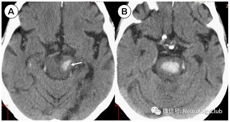 图8:68岁男性患者,脑桥出血;A-B:可见高密度脑桥出血延伸至中脑左前部