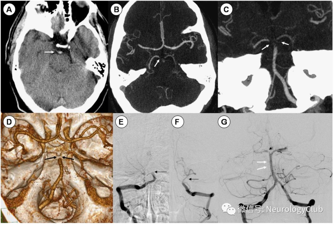 图6:闭锁综合征;53岁男性患者,表现为突发言语含糊,偏瘫和嗜睡;A:CT平扫可见基底动脉尖高密度;B-D:CTA提示基底动脉血栓形成;E-F:血管造影证实基底动脉闭塞;G:对rt-PA治疗后复查,获得部分再通;注意到右侧大脑后动脉仍有残留血栓