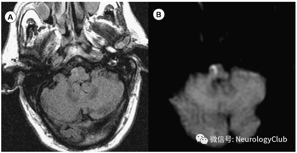 图2:Dejerine综合征;58岁患者,突发眩晕、左侧偏瘫、左侧偏身感觉障碍和共济失调;A:T2WI可见右侧延髓内侧高信号病灶;B:DWI提示弥散受限
