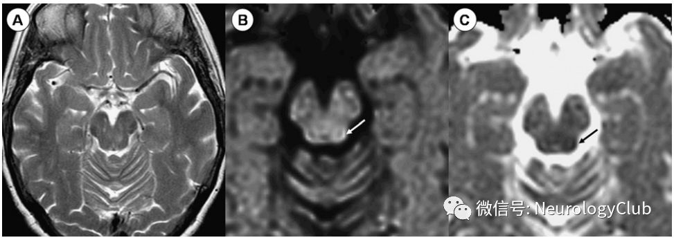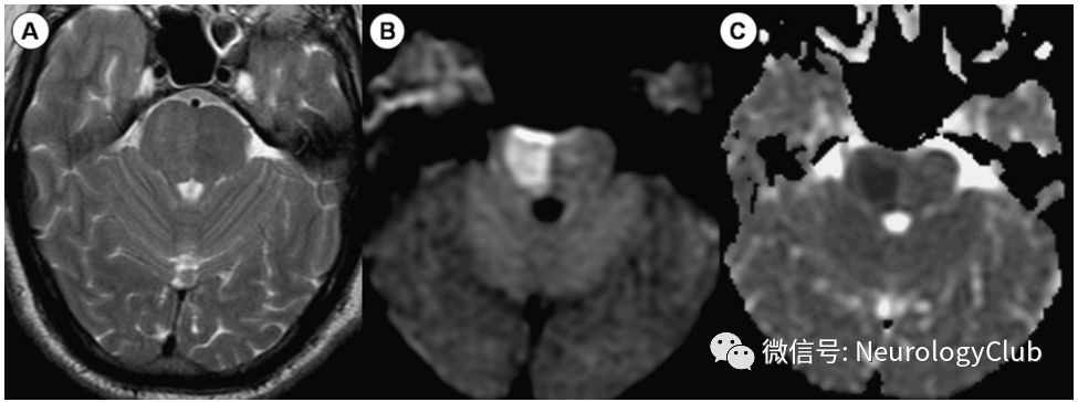 图5:中脑背侧梗死;62岁患者,表现为眩晕、复视、垂直性凝视麻痹;A:轴向t2加权像未显示任何异常。(B)轴向各向同性扩散加权图像。(C)ADC图显示左侧背部血管区域急性缺血性梗死的典型影像学特征