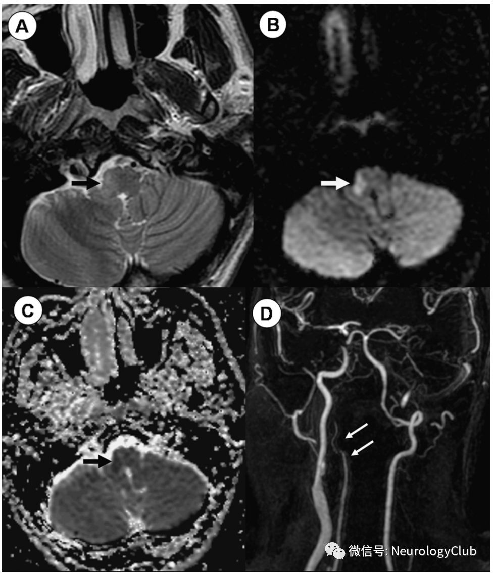 图3:Wallenberg综合征;46岁女性患者,表现为交叉性感觉障碍、Horner综合征、眩晕、复视、共济失调、恶心和吞咽困难;A:T2WI可见右侧延髓外侧高信号病灶;B-C:DWI和ADC证实为急性梗死;D:MRA提示右侧椎动脉夹层