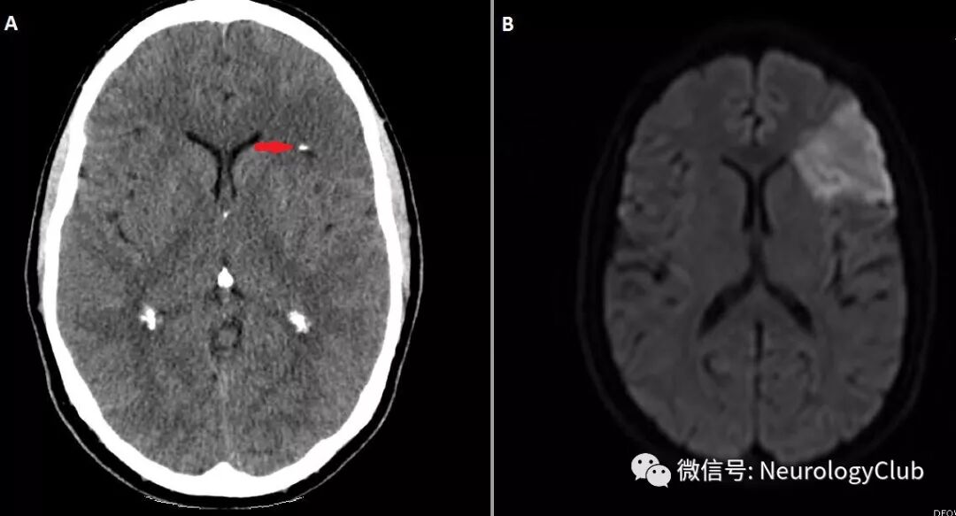 (图2:A:临床症状恶化后复查头颅CT提示新发钙化病灶,远处灰白质分界不清;B:DWI证实为缺血性卒中)