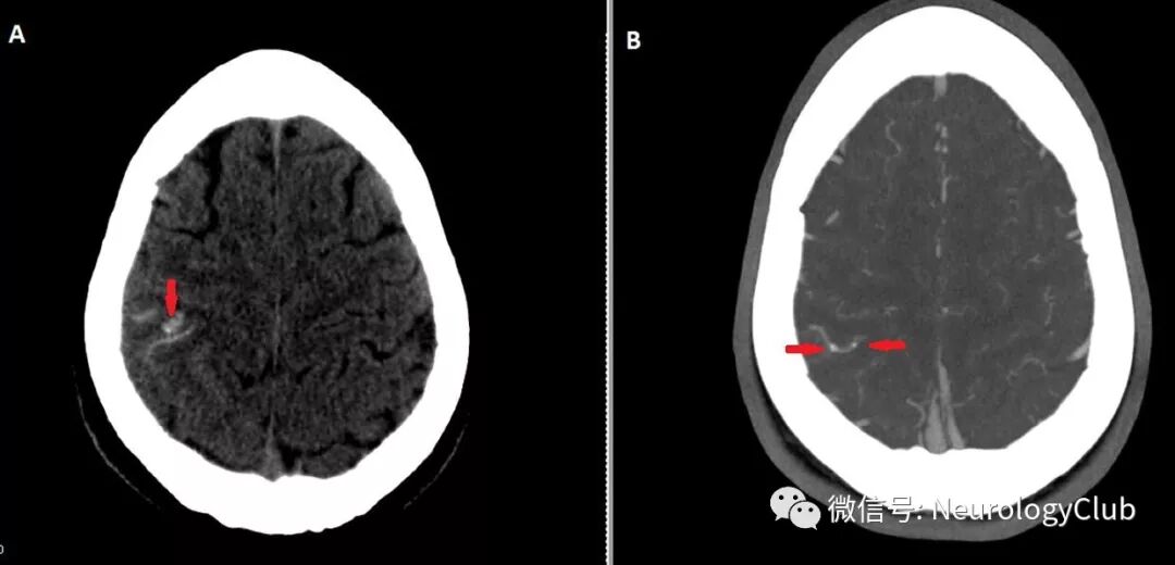 (图1:A:最初的头颅CT平扫可见凸面蛛网膜下腔出血内高密度病灶;B:额叶血管内可见2处高密度病灶)