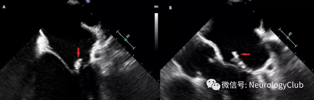 (图3:A:经食道心超提示二尖瓣赘生物;B:经食道心超提示二尖瓣赘生物内可见钙化)