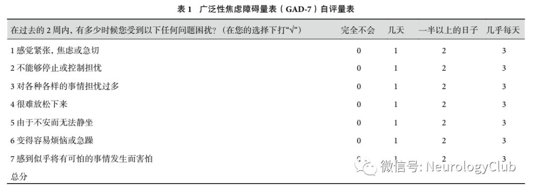 可询问癫痫患者是否存在无原因的恐惧或害怕、过分担心、焦躁、紧张不安等情绪障碍和植物神经功能紊乱症状,再行初筛量表进行检查,初筛阳性者进一步评估诊断并询问焦虑症状与癫痫发作之间的时间关系。国际抗癫痫联盟推荐广泛性焦虑障碍量表(Generalized Anxiety Disorder-7,GAD-7)见表1,作为癫痫伴广泛性焦虑障碍的初筛量表。因其不包含可能与抗癫痫药物(AEDs)副作用产生混淆的躯体症状条目,也不包含与癫痫相关的认知症状或潜在神经系统障碍的条目,因此是适宜癫痫伴焦虑患者的初筛工具。国内一项研究显示GAD-7得分>6提示患有广泛性焦虑障碍,其信度和效度分析提示特异度为91%,敏感度为94%。其他量表如综合性医院焦虑抑郁量表(Hospital anxiety and depression scale,HADS)、焦虑自评量表(Self-rating anxiety scale,SAS)和汉密尔顿焦虑量表(Hamilton anxiety scale,HAMA)也可用于焦虑的筛查和评估,但是焦虑诊断仍要参考相关诊断标准。