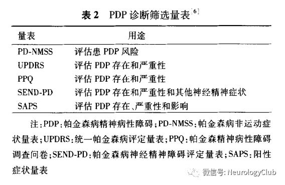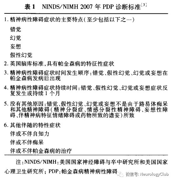 国际上美国国家神经障碍与卒中研究所(NINDS)和美国国家心理卫生研究所(NIMH)工作组于2007年合作首次提出PDP的诊断标准(表1),即患者至少存在以下症状中之一:幻觉、错觉、假性幻觉或妄想,这些症状至少持续大于1个月或者反复发作,并排除其他帕金森病病因[如路易体痴呆(dementia with Lewy bodies,DLB)]和精神疾患(psychiatric disorder)所导致的精神障碍。国内PDP的诊断标准是由中华医学会神经病学分会神经心理学与行为神经病学组、中华医学会神经病学分会帕金森病及运动障碍学组于2013年提出的,凡符合以下1-5条者即可考虑PDP:(1)符合英国帕金森病协会脑库诊断标准或中国帕金森病诊断标准确诊的原发性帕金森病。(2)出现至少1个以下症状:幻觉、错觉、妄想以及假性幻觉。(3)精神病性症状在帕金森病发生之后出现,至少为帕金森病诊断1年后出现,多数为帕金森病诊断10年以后出现。(4)持续时间:幻觉、错觉和妄想以及假性幻觉反复发生,或持续1个月。(5)需排除其他疾病导致的精神病性症状,如DLB、精神分裂症、精神分裂样疾病、伴有精神病性症状的情感障碍及药物导致的精神病性障碍或谵妄状态。(6)伴发情况:应注明有或无自知力,有或无痴呆,是否在抗帕金森病治疗。
