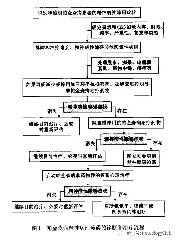 PDP需要综合治疗。尽早干预治疗可以提高帕金森病患者的预后。总的来说治疗方面首先需要去除可能引起PDP的病因,消除引起或促进幻觉发作的医疗因素,例如需要严密监控抗胆碱能药物、抗抑郁药物、毒品和镇静药物的使用情况。减少多巴胺能药物的使用,这样能够改善PDP的病情。对于减少多巴胺能药物,其目标是应用最小剂量的药物而不影响对帕金森病运动症状的控制。一般共识推荐首先减少或停用抗胆碱能类药物,其次是金刚烷胺、单胺氧化酶B(monoamine oxidase B)抑制剂、多巴胺激动剂和儿茶酚-O-甲基转移酶抑制剂,如果确实需要,最后减少左旋多巴的用量。如果减少多巴胺能药物不能有效控制PDP发生,可以加用抗精神病药物,研究显示对PDP的治疗最为有效的是氯氮平(clozapine),另一个可用的药物是喹硫平(quetiapine),二者均不加重帕金森病的运动症状。最近研发的新药匹莫范色林(pimavanserin,PVS)也可以使用,其目前已经成为一线治疗用药。PDP的诊断治疗流程见图1。