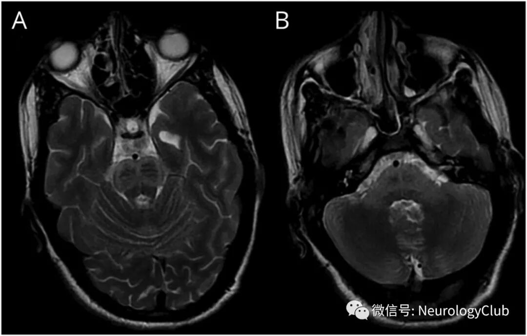 (图2:脑MRI可见腹侧脑桥[A,B]和双侧小脑中脚[B]T2WI高信号)