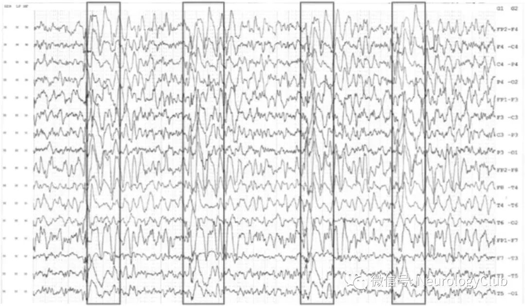 (图1:脑电图提示全面性,周期性的,刻板的,高幅尖波和慢波发放,持续1-2秒,每5-7秒出现一次)
