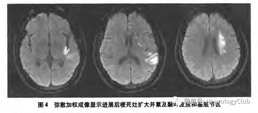 另有研究表明,分水岭梗死往往预示着END的发生,尤其是内分水岭梗死。后者多表现为多发性梗死,且通常伴有严重的大动脉狭窄,血流动力学障碍可能是其最主要的发病机制。Kim等报道了12例伴有颅内动脉重度狭窄的小卒中患者,根据梗死部位和分布特点,将急性期DWI显示的梗死灶分为4种模式:内分水岭梗死、皮质分水岭梗死、皮质支梗死和深穿支动脉梗死,结果显示,END更多见于内分水岭梗死。随后的一项研究共纳入了95例伴有大脑中动脉或基底动脉中到重度狭窄的小卒中或短暂性脑缺血发作(transient ischemic attack,TIA)患者,END发生率为14.7%,logistic回归分析显示,分水岭梗死是END的独立预测因素(P=0.004)。虽然分水岭梗死的病理生理学机制仍存在争议,但一般认为低灌注与微栓子共同导致了分水岭梗死,低灌注导致的微栓子清除障碍在分水岭区更为多见,易出现卒中进展。因此,早期神经影像学发现,尤其在DWI显示病灶分布散在,可能有助于预测END的发生(图2-4)。