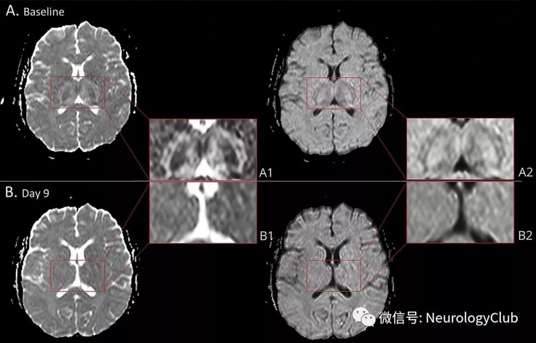 (图2:A:入院时,ADC和DWI可见双侧丘脑靶样病灶和水肿;B:第9天,ADC和DWI可见病灶较前消退)