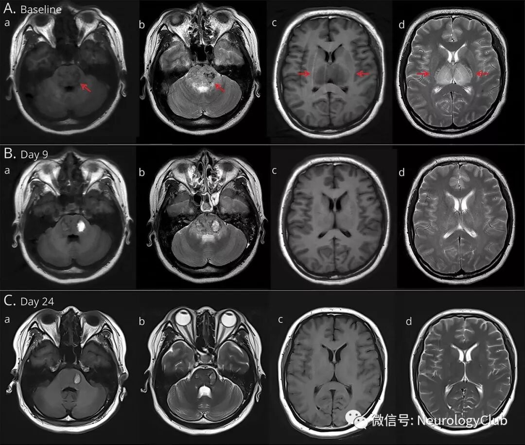(图1:A:入院时MRI提示脑桥[A.a-A.b]T1WI和T2WI低信号,以及双侧丘脑[A.c-A.d]T1WI低信号和T2WI高信号,证实为出血性坏死;B-C:复查MRI可见脑桥[B.a和C.a:T1WI;B.b和C.b:T2WI)和丘脑病变[B.c和C.c:T1WI;B.d和C.d:T2WI]逐渐好转)