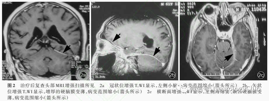 诊断与治疗经过 临床诊断为抗中性粒细胞胞质抗体相关血管炎,继发性肥厚性硬脑膜炎(HP)。为排除感染,明确病理性质后指导治疗,建议行硬脑膜组织活检术,患者及其家属顾虑相关风险拒绝。予泼尼松50mg/次、1次/d口服,每2周减量5mg,莫昔沙星0.40g/次、1次/d口服抗感染,曲马朵50mg/次、1次/晚口服镇痛,治疗10d后肝功能试验明显升高,考虑药物相关肝损伤可能,停用莫昔沙星和曲马朵,改为必需磷脂(易善复)456mg/次、3次/d和甘草酸二铵(甘利欣)150mg/次、3次/d口服改善肝功能,体温恢复正常,症状明显好转。患者共住院28d,出院后1个月门诊随访,症状无反复,复查增强MRI显示,增厚的硬脑膜变薄,强化征象减轻,病变范围缩小(图2)。