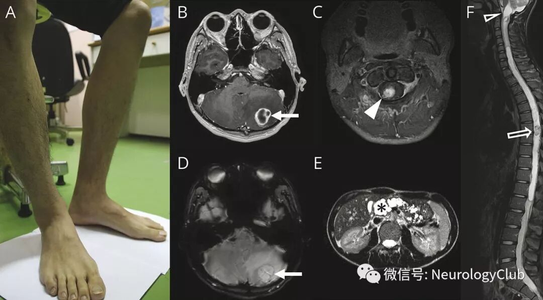 (图:A:小腿萎缩;B-C:增强T1可见左侧小脑和颈髓延髓交界处的血管母细胞瘤;D:梯度回波序列可见供血动脉;E:T2WI可见多发胰腺囊肿;F:T2WI可见T7-8血管母细胞瘤,延髓空洞和胸椎脊髓空洞)