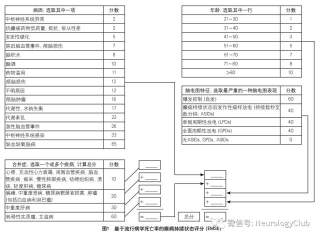 EMSE评分也存在自身的缺陷。首先,该评分没有把发作类型作为评价项目。不同的发作类型其死亡率有很大不同,比如当惊厥性癫痫持续状态合并非惊厥性癫痫持续状态时,死亡率会显著升高。微小抽动型癫痫持续状态死亡率为65%,而全面惊厥性癫痫持续状态死亡率为27%。其次,EMSE评分较为细化的指标分层在提高预测准确性的同时,使计算变得繁琐,不利于临床使用,但在回顾性研究中可作为癫痫持续状态患者死亡风险分层的有力工具。