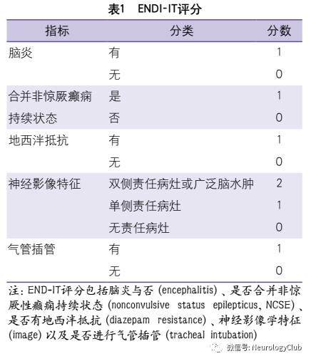癫痫持续状态患者即使存活下来也常常伴有不同程度的神经功能损害以及认知功能的下降,因此,除了关注死亡风险,我们还需要关注癫痫持续患者的功能恢复情况及生活质量。END-IT评分由高琼等人发表于2016年,是目前唯一一个预测癫痫持续状态患者出院3个月后肢体功能恢复情况的评分。该评分的建立是基于132例惊厥性癫痫持续状态患者的临床资料,全面纳入了人口学、临床表现、影像学特征、癫痫持续状态的演变及对治疗的反应性等数据,通过多因素回归分析得出5个与出院后3个月预后不良(mRS>2分)相关的独立危险因素,进而以此5项参数作为预测模型的评价指标设计出针对癫痫持续状态的临床评分(表1)。不同于STESS评分赋值的武断性,ENDIT评分的每一项指标都是根据多因素回归分析中相应的β系数进行赋值。END-IT评分总分为6分,其节点值(3分)的敏感度为83.87%,特异度为68.57%。受试者工作特征曲线(receiver operating characteristic curve,ROC)分析表明,与STESS、EMSE评分相比,END-IT评分的预测能力更强[曲线下面积(area under roc curve,AUC)0.833,95%可信区间(confidence interval,CI)0.766-0.900]。END-IT评分包括脑炎与否、是否合并非惊厥性癫痫持续状态、是否有地西泮抵抗、神经影像学特征以及是否进行气管插管5项内容,取各项指标首字母组合而命名。其中地西泮抵抗是指两次静脉给予足量地西泮(0.2mg/kg,一剂最高10mg,间隔5min)仍不能缓解发作。神经影像学指标中的病灶是指引起本次发作的责任病灶。由于脑电图、血清标志物的复杂性和不确定性,END-IT预测模型没有纳入生物学标志物。虽然END-IT评分已从临床多个角度对癫痫持续状态的结局进行预测,但由于该评分的建立是基于单中心惊厥性癫痫持续状态患者的数据,今后仍需要多中心的研究进行外部验证,并且对非惊厥性癫痫持续状态预后预测的准确性也有待进一步验证。