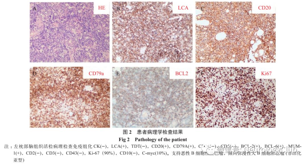 诊断 本病例转诊至神经外科行立体定向脑活检。左枕部脑组织活检病理检查示:免疫组化CK(-),LCA(+),TDT(-),CD20(+),CD79A(+),CD23(-),CD5(-),BCL-2(+),BCL-6(+),MUM(+),CD2(-),CD3(-),CD43(-),Ki-67(90%),CD10(-),C-myc(10%)。支持恶性B细胞性淋巴瘤,倾向弥漫性大B细胞淋巴瘤(非活化亚型),见图2。诊断为PCNSL。