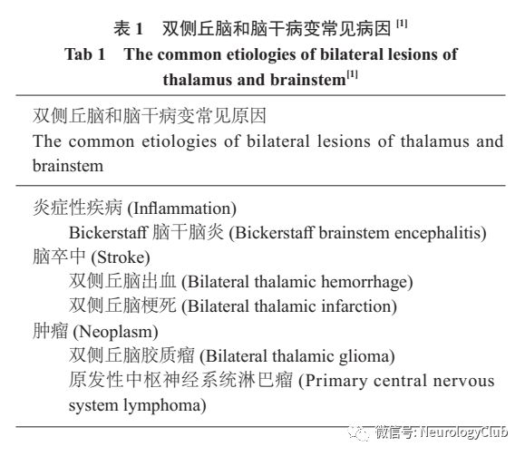 病史小结 患者为76岁男性,头晕起病,症状进行性加重,逐渐出现意识障碍、视物重影、肢体乏力症状。脑脊液检查示白细胞和蛋白升高。头颅MRI可见病灶主要位于双侧丘脑和脑干,双侧丘脑和脑干病变常见病因(表1)。