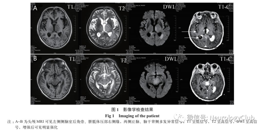 病例病史 住院号:6112×××,男,76岁。因“头晕20d,加重伴双眼睑下垂10d。”入院。患者无明显诱因出现头晕,主要表现为昏沉感,无视物旋转和自身旋转感、无恶心呕吐、无肢体乏力等症状。于外院就诊行头颅MRI检查示中脑,双侧丘脑及胼胝体压部肿胀,予抗血小板聚集等治疗后头晕症状无改善,10d前逐渐出现嗜睡、视物重影、肢体乏力症状。病程中,患者无发热,大小便正常,体重无明显下降。
