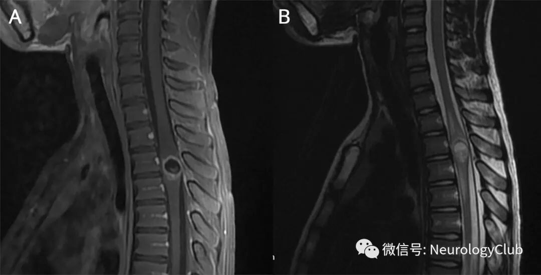 (图1:A:矢状位增强T1;B:矢状位T2WI;MRI可见位于T3-T4水平的髓内囊性病变,伴厚壁和强化,周边可见血管源性水肿;病变在T2WI上呈高信号[由于囊液的蛋白质成分],T1上WI可见条纹状高信号[或提示退化的头节],符合囊虫病胶体期[可貌似肿瘤性病变])