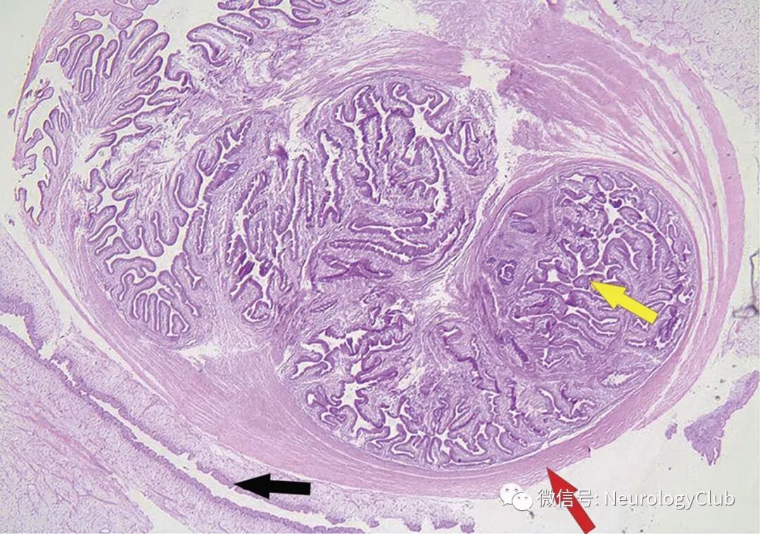 (图2:组织病理学可见包在荚膜内的囊尾蚴幼虫[H&E,40×];外膜[黑箭],幼虫头节[红箭]和幼虫肠道[黄箭])