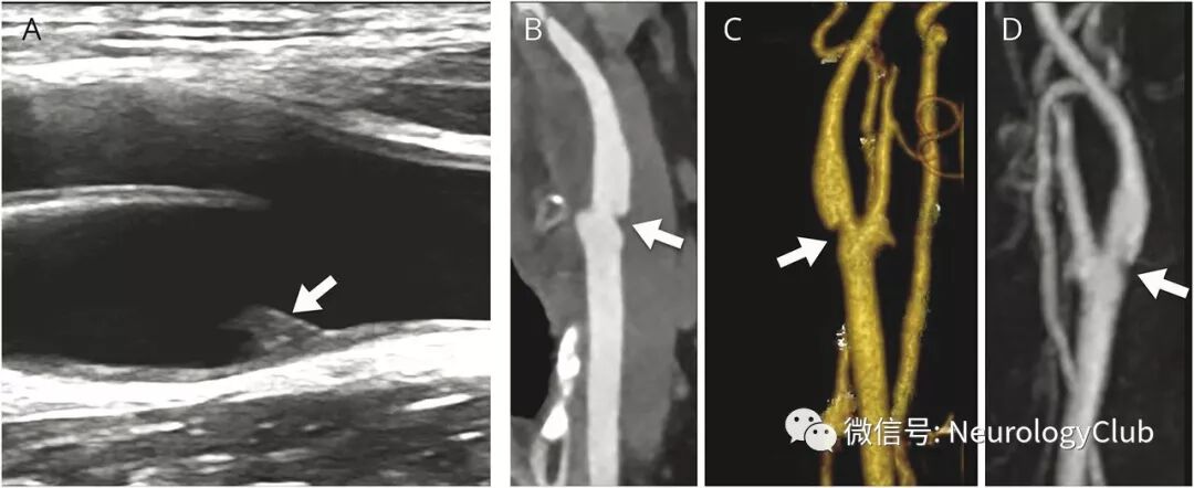 (图1:多普勒超声[A],CT血管造影[B-C]和3D增强MR血管造影[D]可见颈动脉蹼;引自:Renard D, Hampton J, Keita M, Freitag C.Teaching NeuroImages: Multimodality imaging of carotid web.Neurology. 2018 Apr 24;90(17):e1541.)