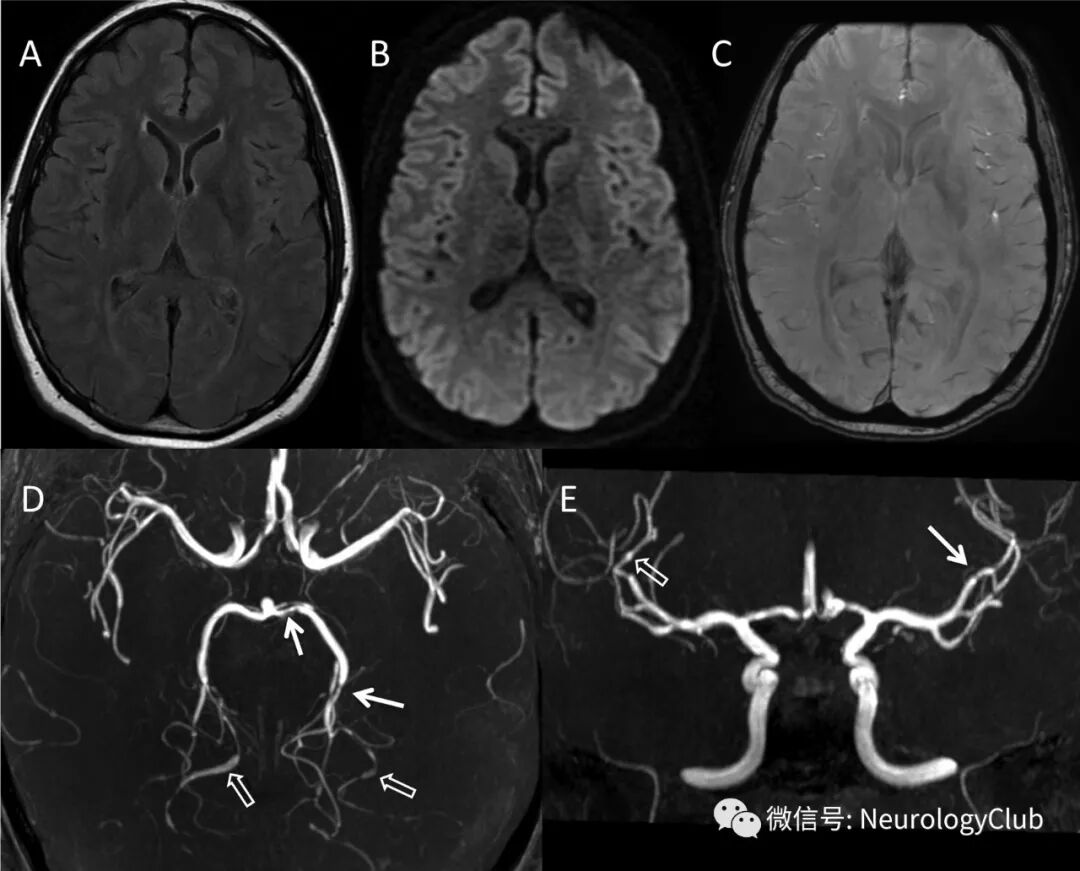 (图:A:FLAIR;B:DWI;C:SWI;头颅MRI未见明显异常,排除梗死、出血和可逆性后部脑病综合征;D-E:MRA可见广泛的多发动脉痉挛,主要累及大脑后动脉,呈“串珠样”外观,主要因血管交替性狭窄和扩张所致;大脑前循环,尤其是大脑中动脉同样受累)