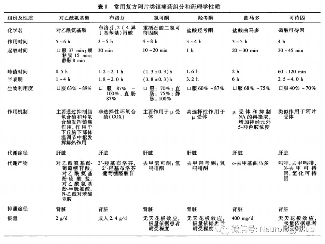 复方阿片类镇痛药主要由一种阿片类药物(如可待因、氢可酮、羟考酮、曲马多)和一种非甾体类抗炎药(如对乙酰氨基酚、布洛芬)组成。组分不同导致联合作用机制、起效时间、作用时间、代谢途径等亦有所不同,复合使用后可起到协同镇痛、延长作用时间、减少药物不良反应等效果。常用复方阿片类镇痛药组份和药理学性质见表1。