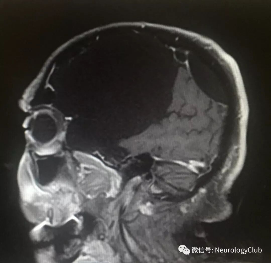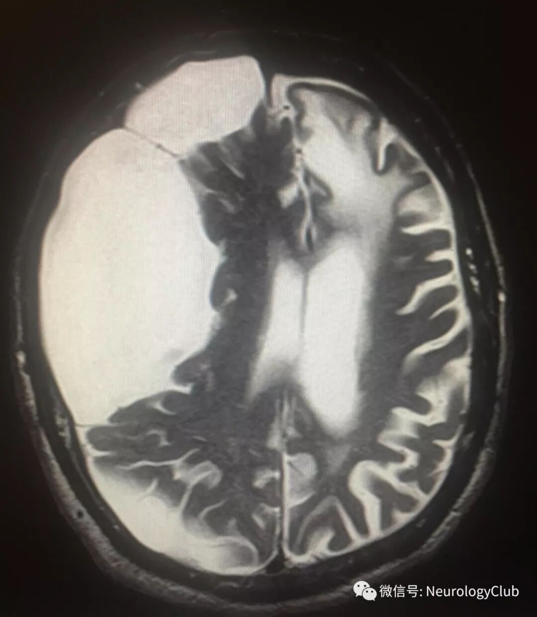 MRI可见一巨大囊肿伴中线移位,其内容物信号改变同脑脊液,沿前后缘分隔,邻近骨性结构变薄。占位效应伴有脑沟消失和右侧脑室受压,中线向左侧移位10mm以及出现大脑镰下疝。符合蛛网膜囊肿表现。
