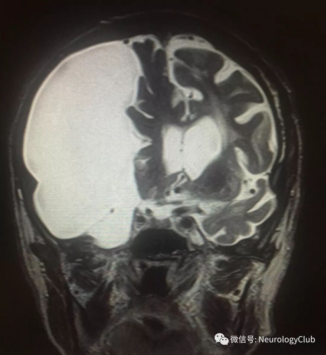 (图1:冠状位T2WI可见右侧大脑半球囊性病灶;有占位效应,伴中线移位和大脑镰下疝;在侧裂池分叉处可见大脑中动脉)