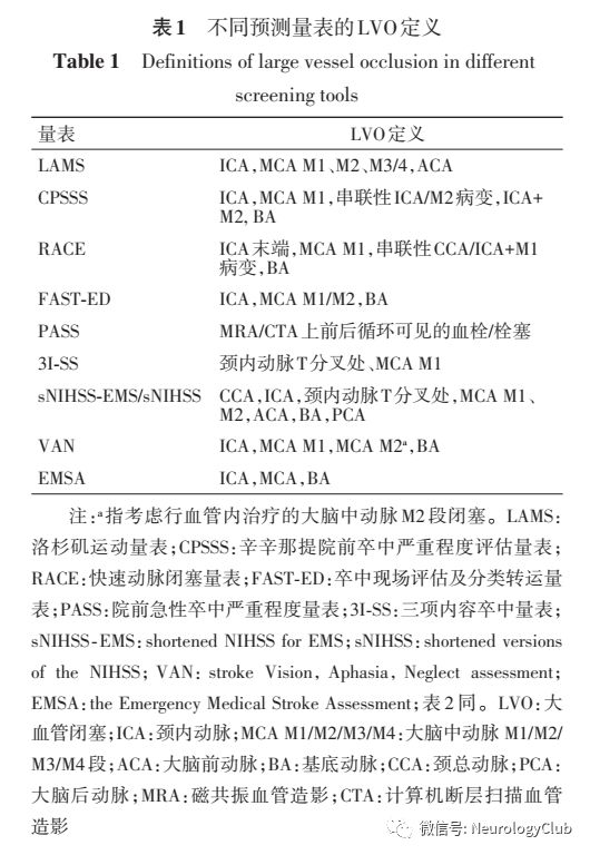 大血管闭塞(large vessel occlusion,LVO)占缺血性脑卒中的28%-46%,静脉溶栓效果不佳,早期再通率仅为21%,病死率、致残率高达70%以上。目前关于LVO定义尚无统一标准,不同研究涵盖血管范围不同(表1)。指南推荐对于治疗时间窗内的LVO患者尽早开展桥接或血管内治疗,以改善脑灌注,拯救缺血组织。但由于血管内治疗时间窗多在6h以内,同时具备血管内治疗技术的综合性卒中中心数量有限,Smith和Schwamm建议健全卒中急救系统及机构间转诊机制,在不具备影像学检查的条件下,推荐院前使用卒中严重程度评估工具,用于判断患者是否存在LVO和血管内治疗可能,以确保把患者及时转运至综合卒中中心。