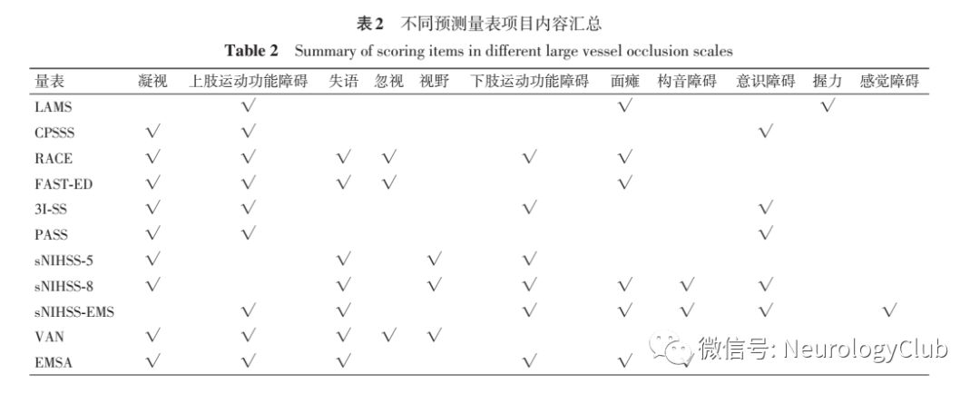 2018年发表的由Gropen等提出的EMSA量表再次拓展了院前LVO预测工具的选择性,其可有效识别AIS,对于AIS合并LVO患者的预测效能与CPSSS、FAST-ED及RACE相当。且内容简洁(表2),易于操作,未来有望通过进一步院前验证,成为一个综合的院前卒中紧急评价量表。
