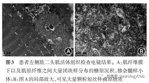 该类患者可合并存在酮症性低血糖和高脂血症。本患者血糖正常,肝脏不大,胆固醇和转氨酶仅轻度升高。肌电图在该病可以出现肌源性及神经源性改变,该患者肌电图除肌源性及神经源性损害外,还出现大量肌强直电位,尚未见于其他报道。肌肉活检除发现大量短丝样颗粒沉积外,还发现巨大线粒体内出现类结晶包涵体,提示该病伴线粒体异常。糖原脱支酶(GDE)的活性检测对于该病有辅助诊断意义,国外多通过肌肉组织免疫印迹方法测定,国内曾有以极限糊精为底物,测定肌肉匀浆中的GDE活性的方法报道。但是酶活性高低与症状不完全一致。